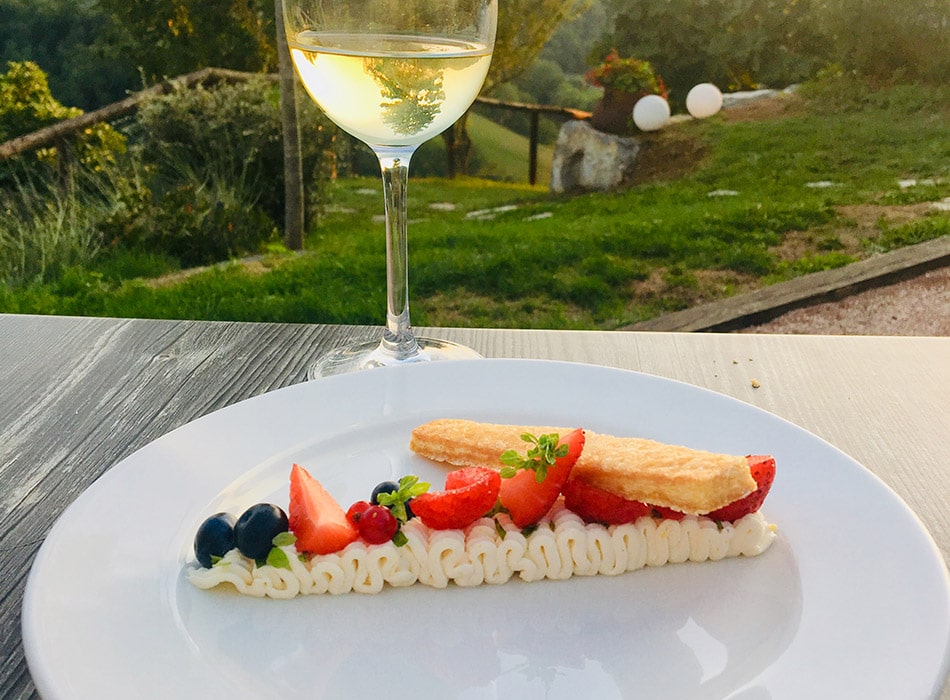 The petanque court gave way to gastronomy and the Pergola restaurant was born. It has a serene, open view of the Cele Valley and sits cosily under the bespoke wooden pergola which gives shade during the day and atmosphere in the evening.